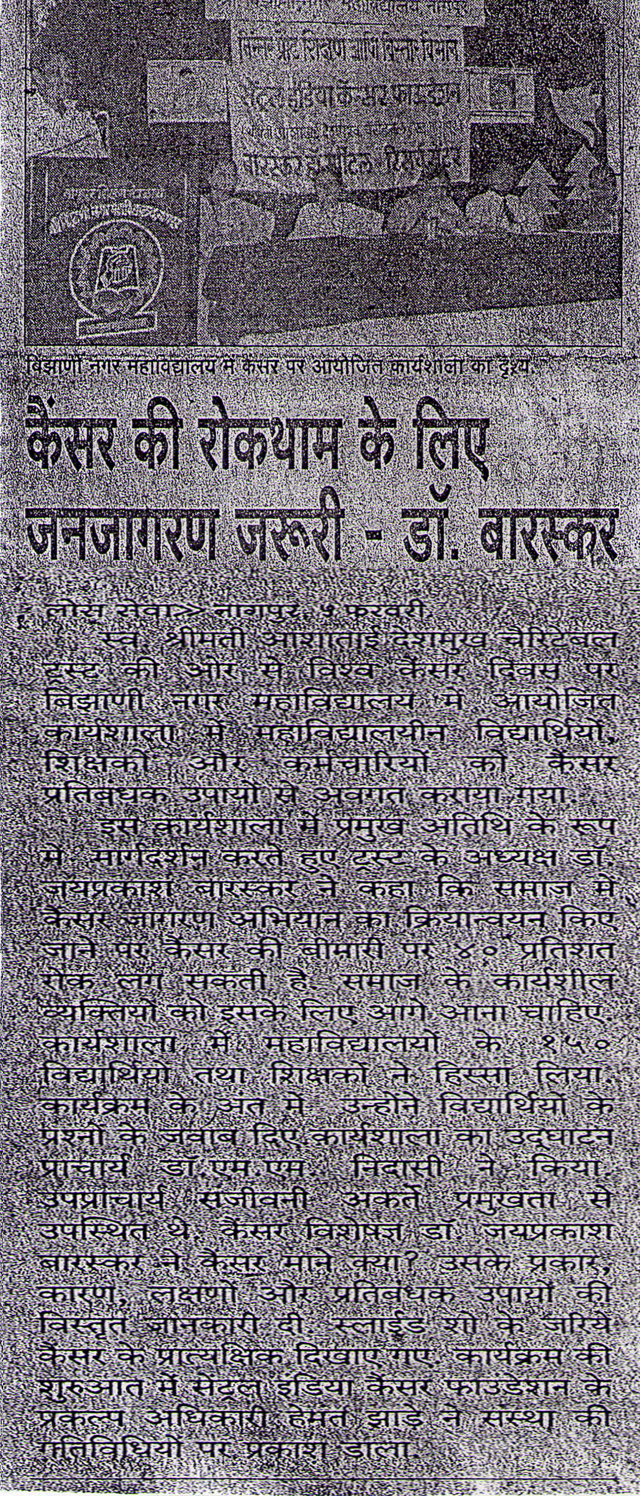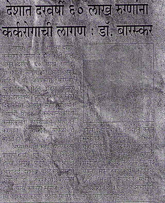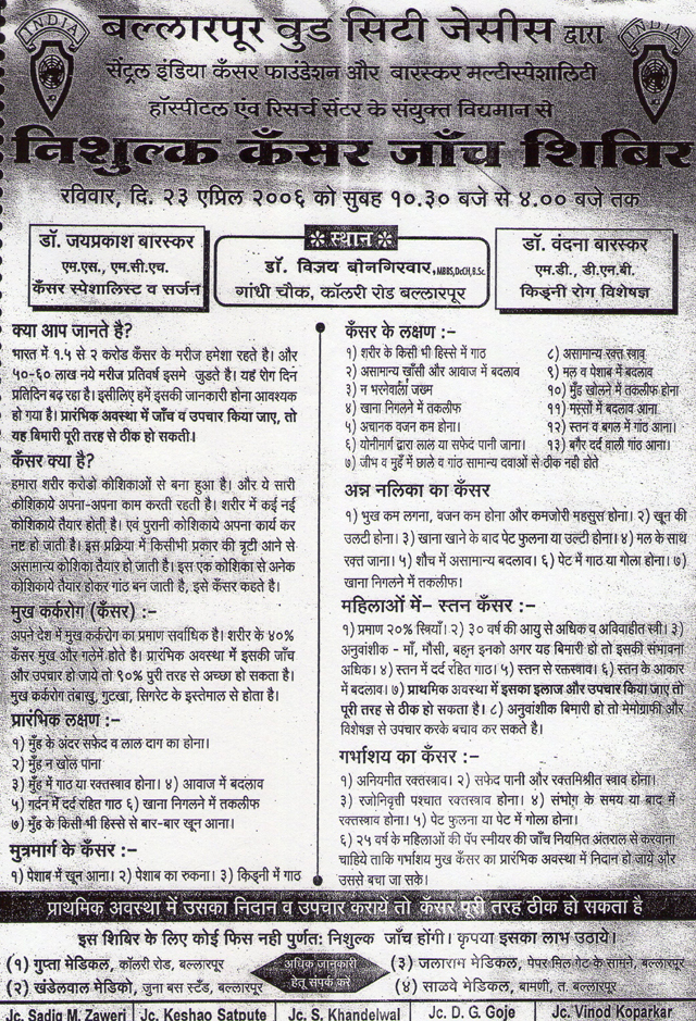 This is to Certify that Dr. Baraskar arrange a cancer Detection Camp at Mahatma Fuley Sanskrutic Bhawan and Examined 124 Patients in this camp. The patient of cancer directed properly by him for further managment.He also take the biopsy & FNAV of the suspected patients.