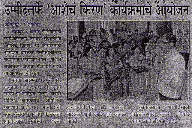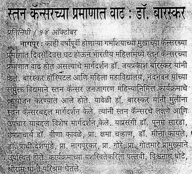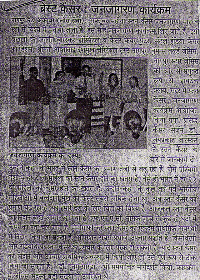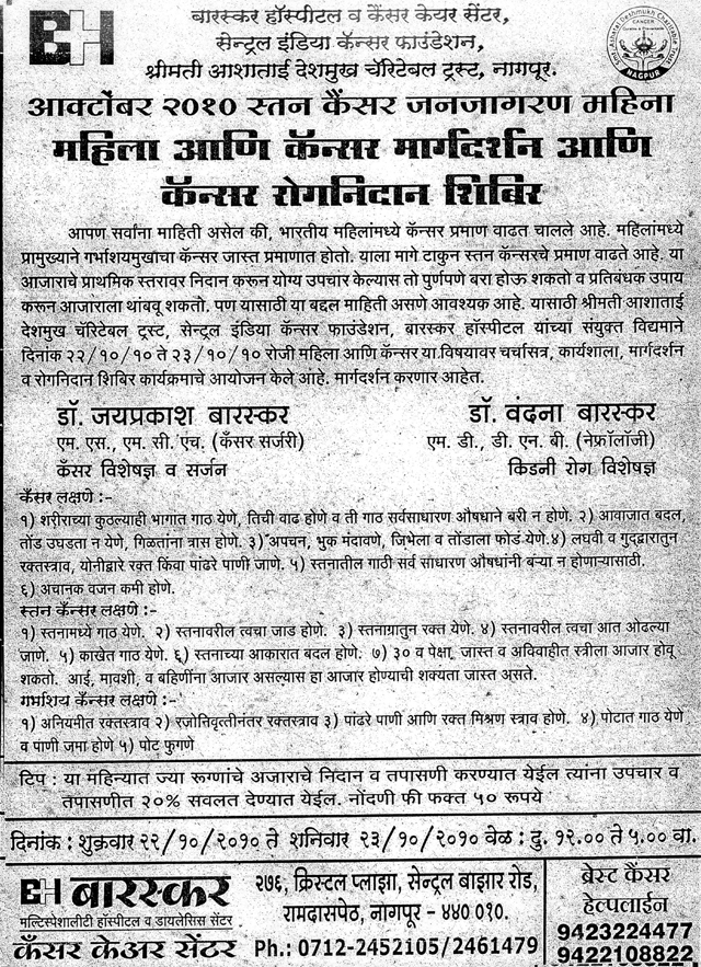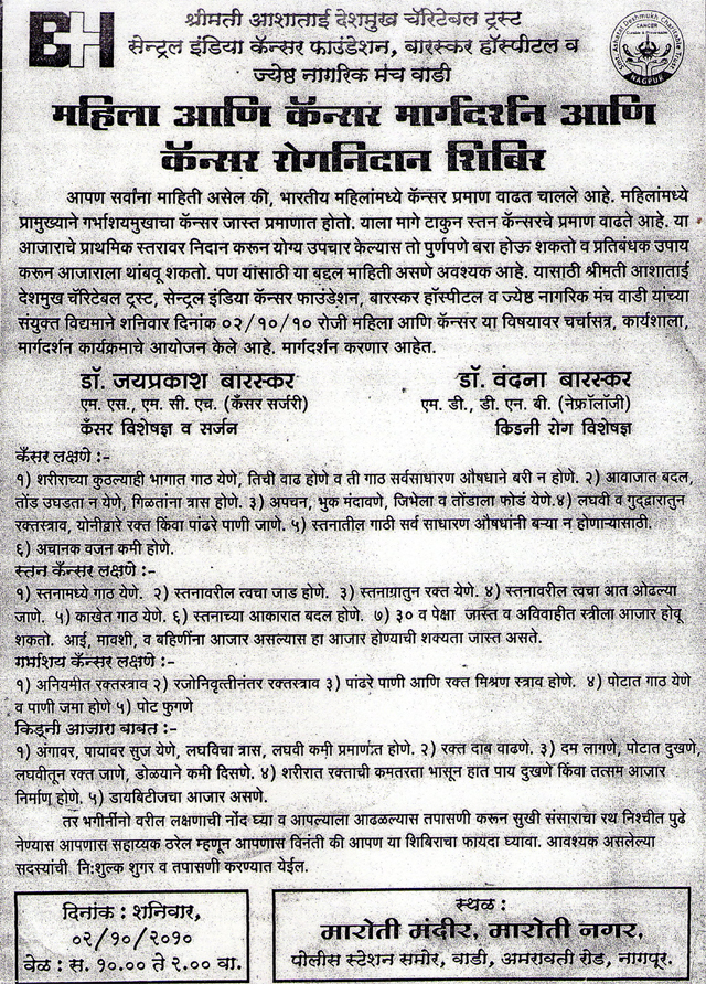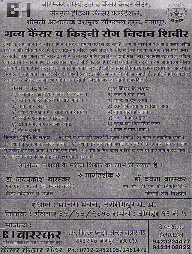 This is to Certify that Dr. Baraskar arrange a cancer Detection Camp at Mahatma Fuley Sanskrutic Bhawan and Examined 124 Patients in this camp. The patient of cancer directed properly by him for further managment.He also take the biopsy & FNAV of the suspected patients.